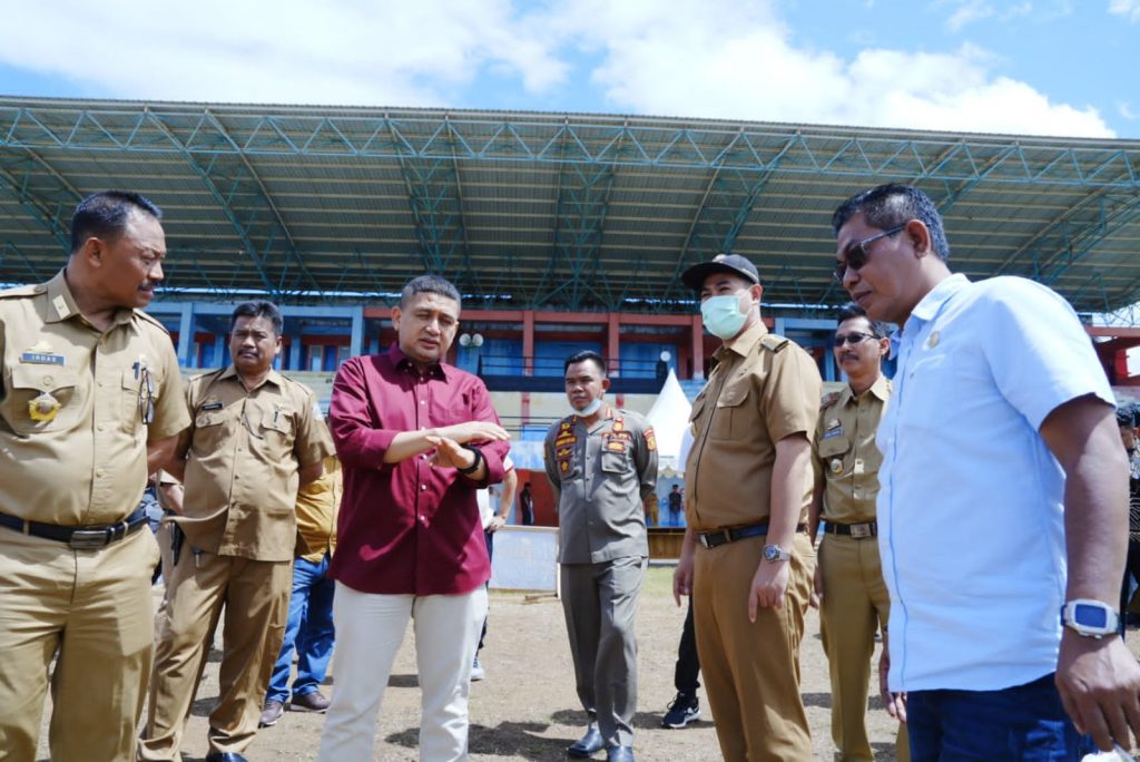 Bupati MYL dan Appi didampingi ketua DPRD Pangkep Haris Gani dan ketua KONI Pangkep Yusuf Syam beserta OPD terkait meninjau kondisi lapangan, tribun penonton dan fasilitas lain stadion Andi Mappe Pangkep.