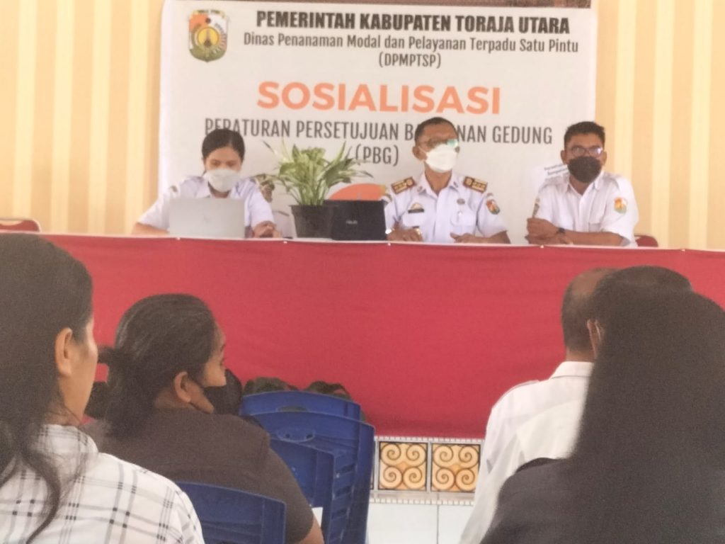 SPIONASE-NEWS.COM,- TORAJA UTARA – Dinas Penanaman Modal dan Pelayanan Terpadu Satu Pintu (DPMPTSP) Toraja Utara mengadakan Sosialisasi Peraturan Persetujuan Pembangunan Gedung (PBG) yang berlangsung diKantor Kecamatan Rantepao Kabupaten Toraja Utara, Rabu (27/4/2022).