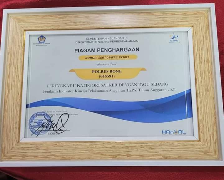 “penghargaan satuan kerja terbaik kedua dari KPPN Provinsi untuk Polres Bone suatu kebanggan tersendiri bagi kami dan ini tidak lepas daripada dari dukungan seluruh personel dalam menjalankan tugas secara professional dengan penggunaan anggaran secara tepat, dan lebih khusus lagi adalah Seksi Keuangan,” jelasnya.