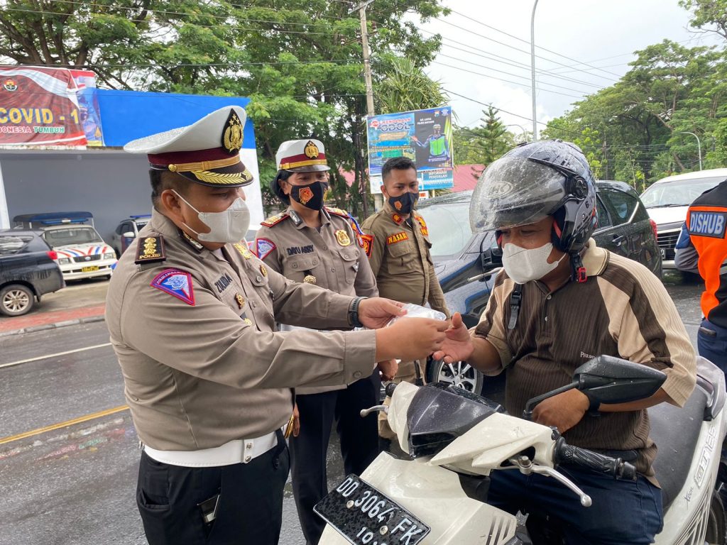 Tim Direktorat Lalu Lintas Polda Sulsel dipimpin oleh Kabag Bin Ops Dit Lantas Polda Sulsel AKBP Zulanda S.I.K M.Si menyapa pengendara bermotor yang sementara melintas di jalan untuk dibagikan masker dan helm sekaligus memberikan imbauan tertib berlalu lintas dan protokol kesehatan.