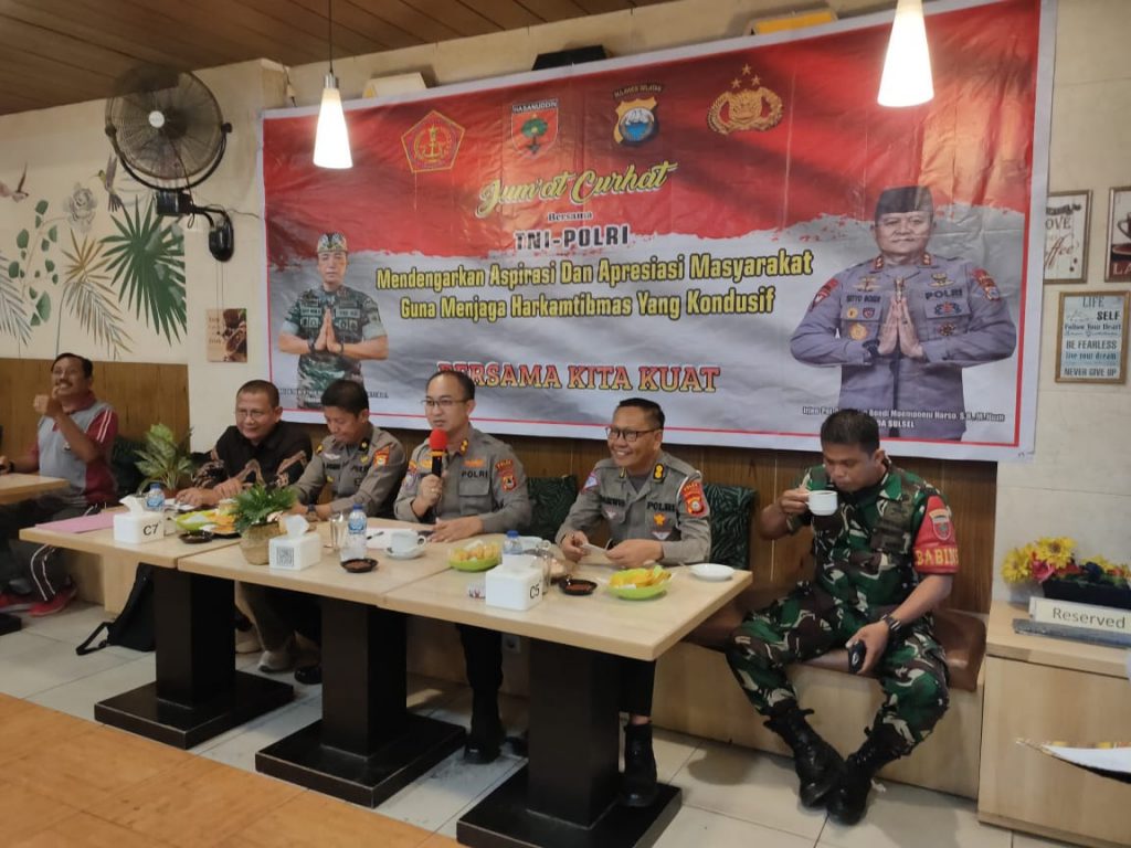 SPIONASE-NEWS.COM,- MAKASSAR – Wadir Binmas Polda Sulsel mewakili Kapolda Sulsel Terima Aspirasi Warga dalam kegiatan Jumat Curhat Di Cafe Daily Jln. Nusantara, Kecamatan Wajo, Kota Makassar, pada hari Jum’at (23/06/2023).