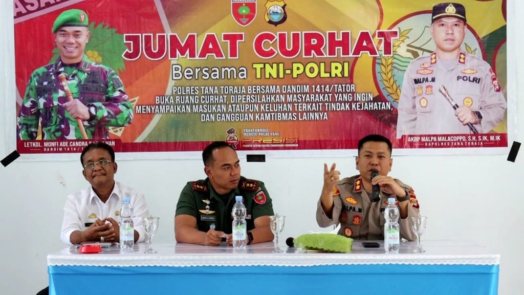 SPIONASE-NEWS.COM,- TANA TORAJA – Memasuki minggu pertama di bulan Juni, Kapolres Tana Toraja AKBP Malpa Malacoppo, S.H., S.I.K., M.I.K., bersama Dandim 1414/ Tator Letkol Inf. Monfi Ade Candra, S.I.P. M. HAN., dan Pemda dalam hal ini diwakili oleh Kasatpol Pamong Poraja Drs. Anthon Toding kembali menggelar kegiatan Jum’at curhat, Jum’at (26/05/2023)